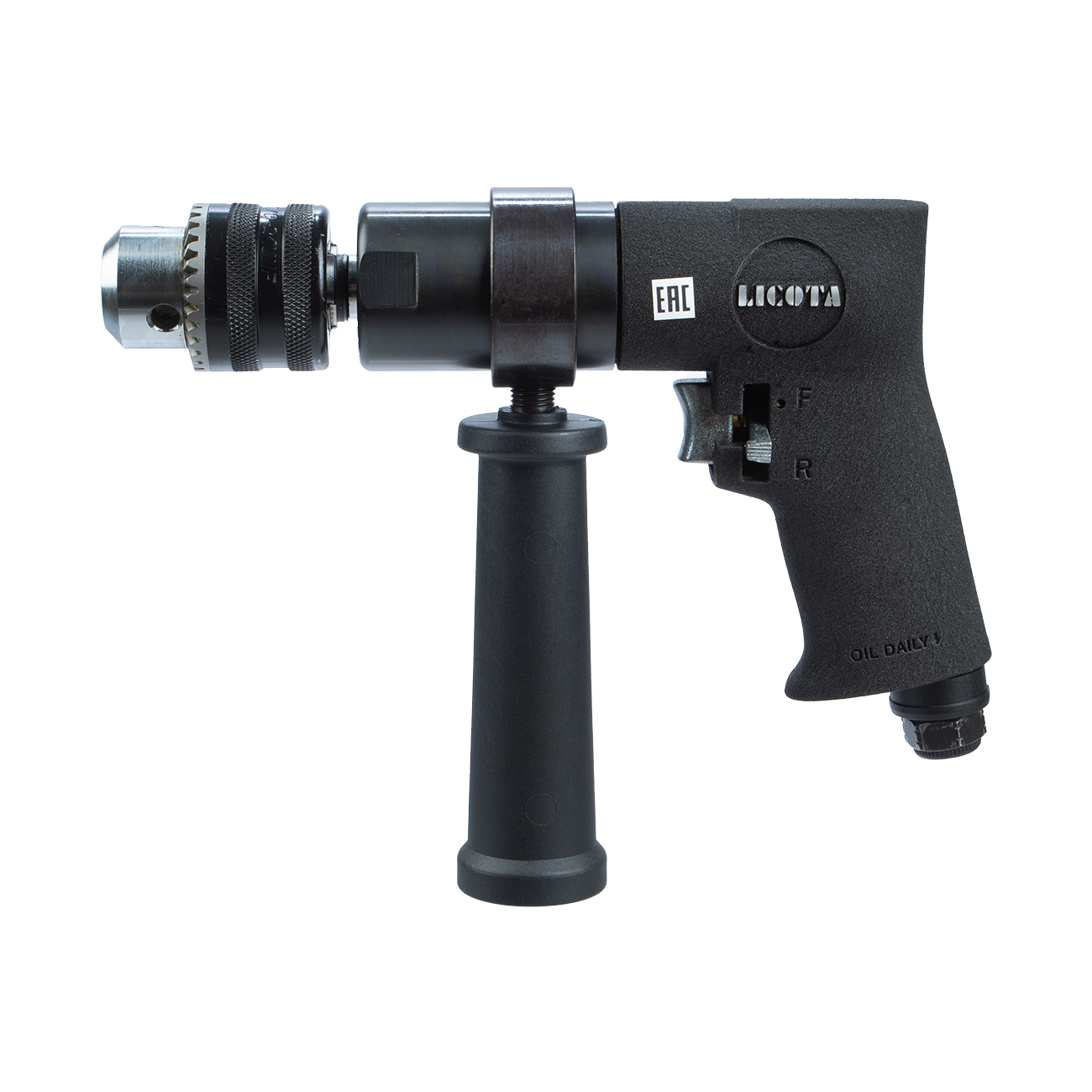 Дрель пневматическая Licota PAD-04004 пистолетного типа в корпусе со съемной рукояткой. Предназначена для сверления сквозных и глухих отверстий диаметром до 13 мм в различных материалах.