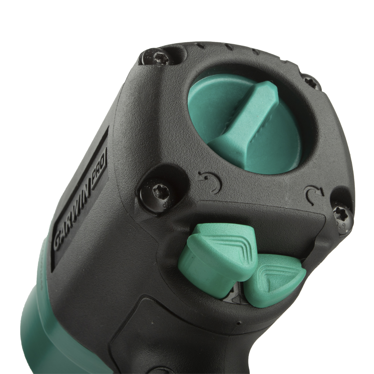 Утопленная ручка переключения скоростей расположена в задней части корпуса, что спасает ее от механических воздействий (например, падения на пол или задевания о деталь подвески). Переключение направления вращения осуществляется двумя кнопками и комфортно осуществляется одной рукой. Восемь режимов работы (4 на закручивание и 4 на откручивание) обеспечивают комфортную работу с резьбовыми соединениями разных размеров.