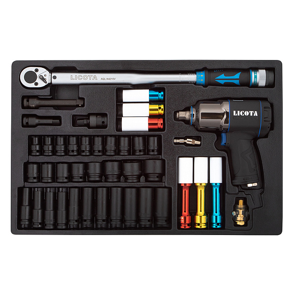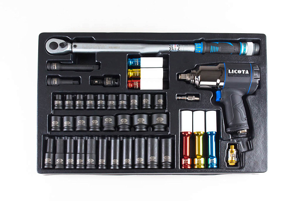 Набор с гайковертом, ударными головками и динамометрическим ключом Licota ACK-381001 в ложементе, 42 предмета. Пневматический гайковерт в легком композитном корпусе. Шестигранные ударные головки разных размеров и конфигураций для работы с большим количеством разноразмерного крепежа. Динамометрический ключ для финальной затяжки крепежа до нужного крутящего момента.