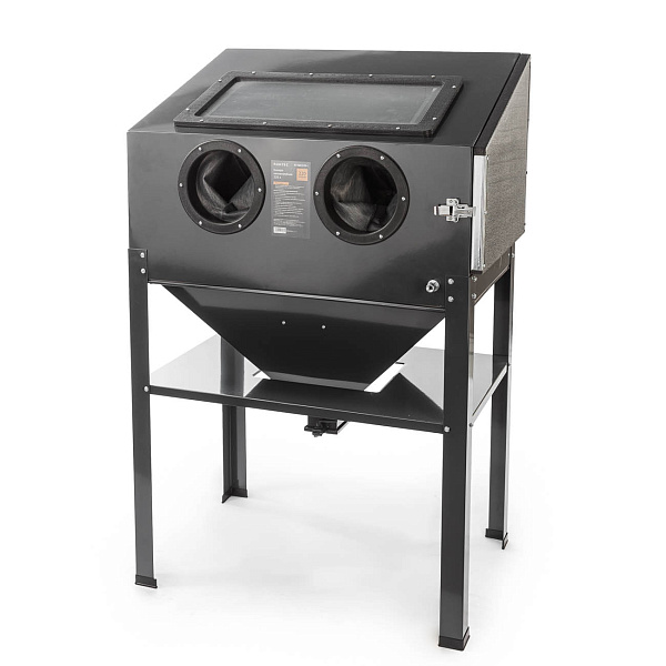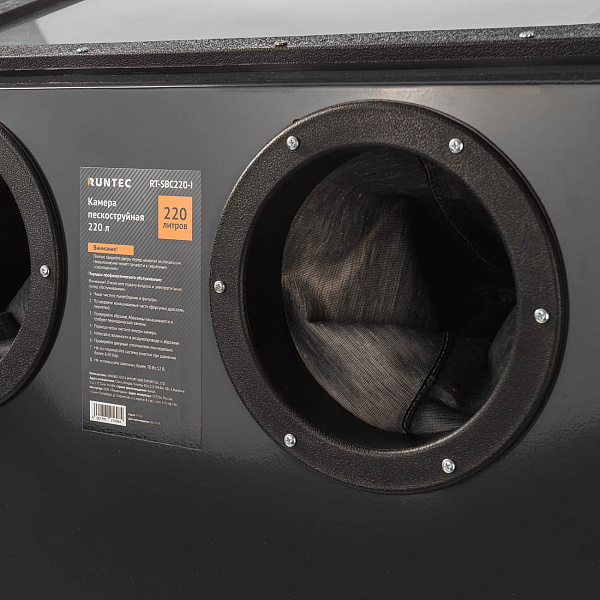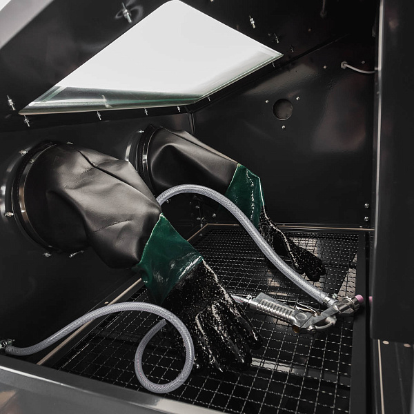 Перчатки, прочно закреплённые на корпусе, надёжно защищают руки от абразива и позволяют удобно переворачивать детали во время обработки. Смотровое окно выполнено из травмобезопасного стекла и оснащено защитной плёнкой, предотвращающей его помутнение.