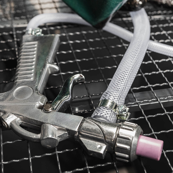 Камера окрашена качественной порошковой краской, что защищает корпус от коррозии и продлевает срок службы оборудования. В комплект входят пистолет с набором форсунок и защитные плёнки. Для работы требуется компрессор.