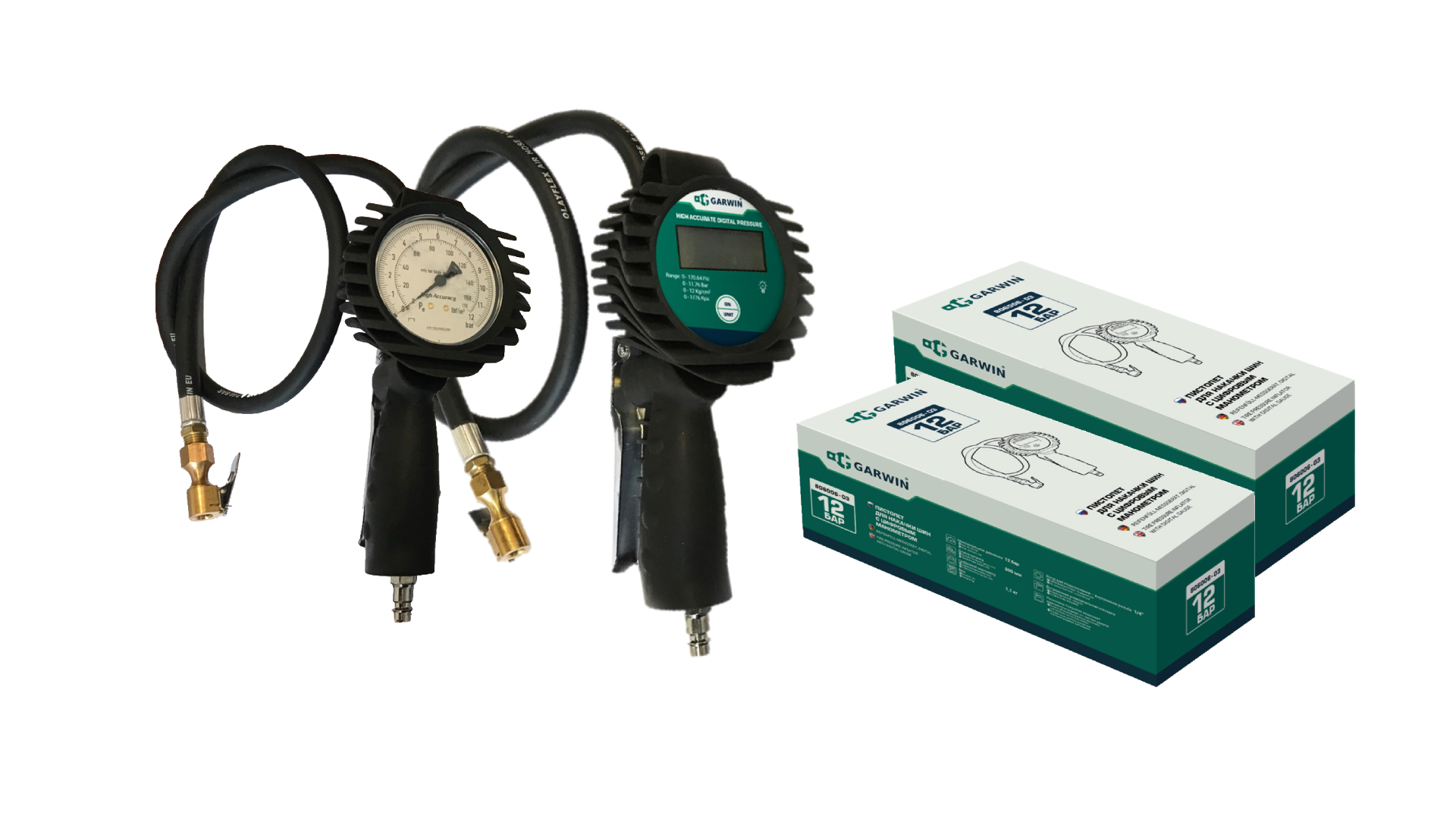 Пистолет для накачки шин GARWIN 806006-01 с универсальной насадкой и механическим манометром для контроля давления.