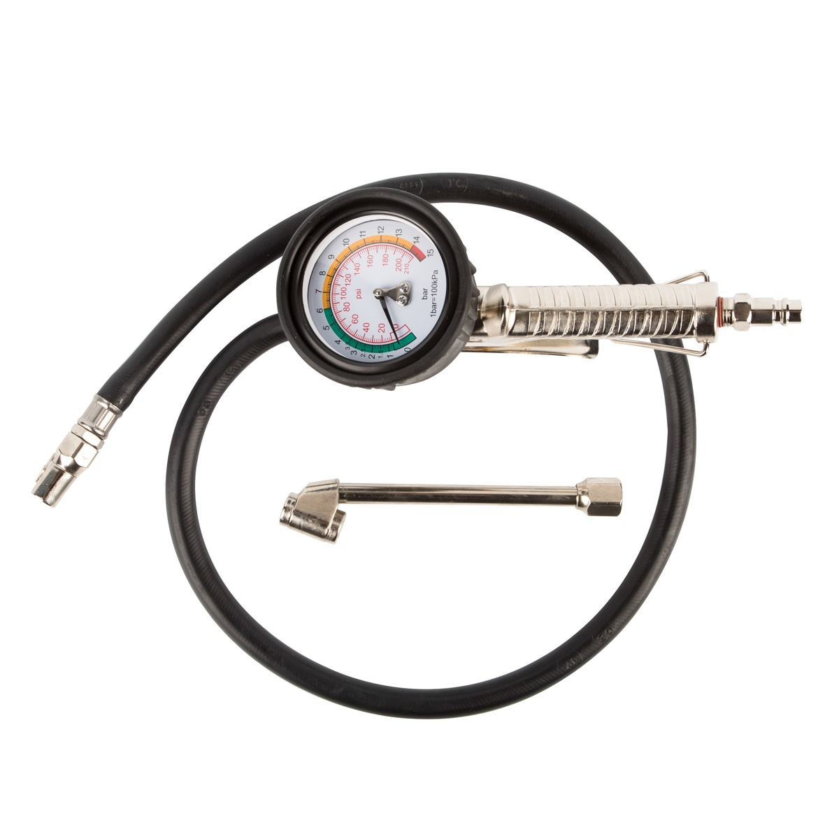 Механический манометр диаметром 2,5 дюйма (64 мм) работает без элементов питания и дает точные показания даже при отрицательных температурах. Двойная шкала позволяет измерять давление в bar и psi, обеспечивая комфортное обслуживание шин от разных производителей и с разными стандартами измерений.