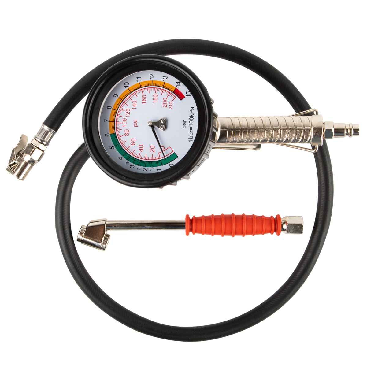 Механический манометр диаметром 3,5 дюйма (90 мм) работает без элементов питания и дает точные показания даже при отрицательных температурах. Двойная шкала позволяет измерять давление в bar и psi, обеспечивая комфортное обслуживание шин от разных производителей и с разными стандартами измерений.