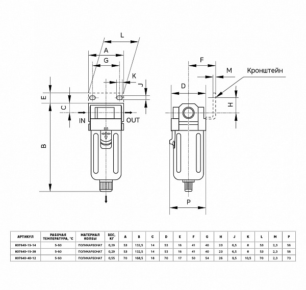 Максимальное рабочее давление - 10 бар. Пропускная способность - 1500 л/мин. Объем колбы - 60 см³. Внутренняя резьба - ¼ дюйма.