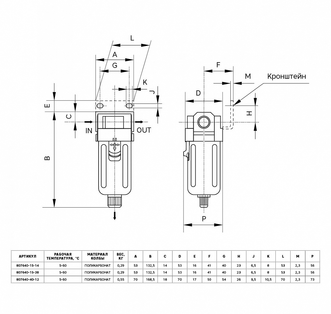 Максимальное рабочее давление - 10 бар. Пропускная способность - 1500 л/мин. Объем колбы - 70 см³. Внутренняя резьба - ⅜ дюйма.