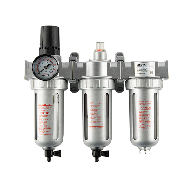 Фильтр-влагомаслоотделитель тонкой очистки трехуровневый Licota PAP-C207B. Применяется как элемент пневмолинии для тонкой очистки воздуха, например, для работы в покрасочной камере.