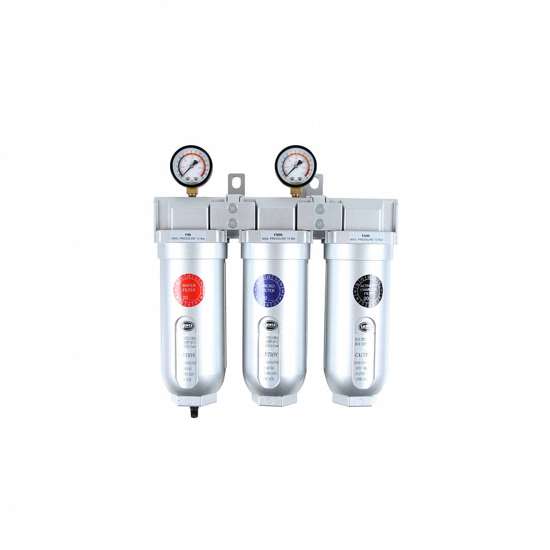 Удаляет из сжатого воздуха частицы масла и влагу, которые пропускают стандартные фильтры. В группе последовательно объединены три фильтра со степенью очистки 5 микрон, 0,1 микрон и дезодорирующий фильтр, что позволяет очистить воздух на 99,9%.