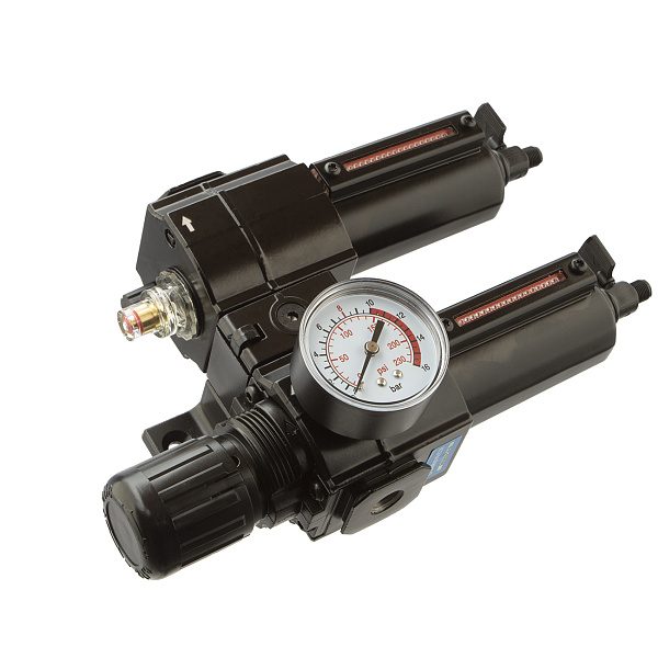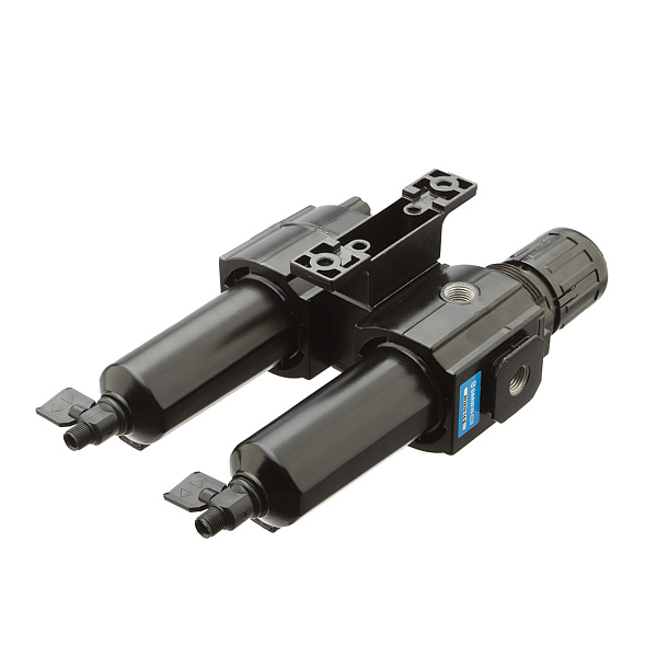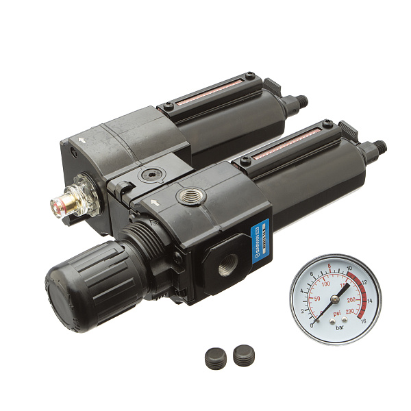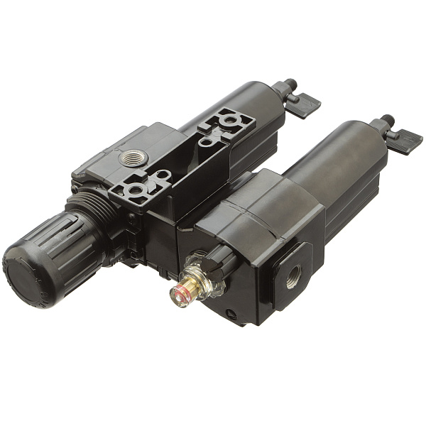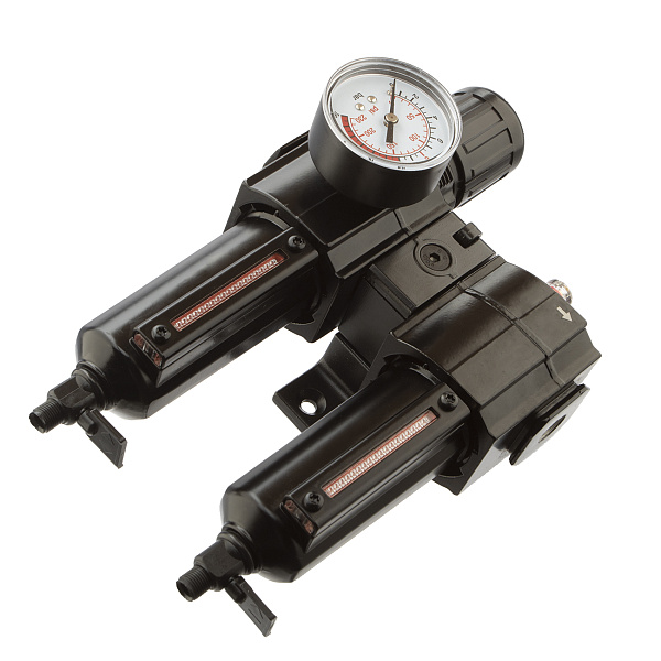 Модульная группа для подготовки воздуха с регулятором давления - это система подготовки воздуха для работы с пневматическим инструментом. Объединяет воздушный фильтр-осушитель, редуктор с манометром и лубрикатор.