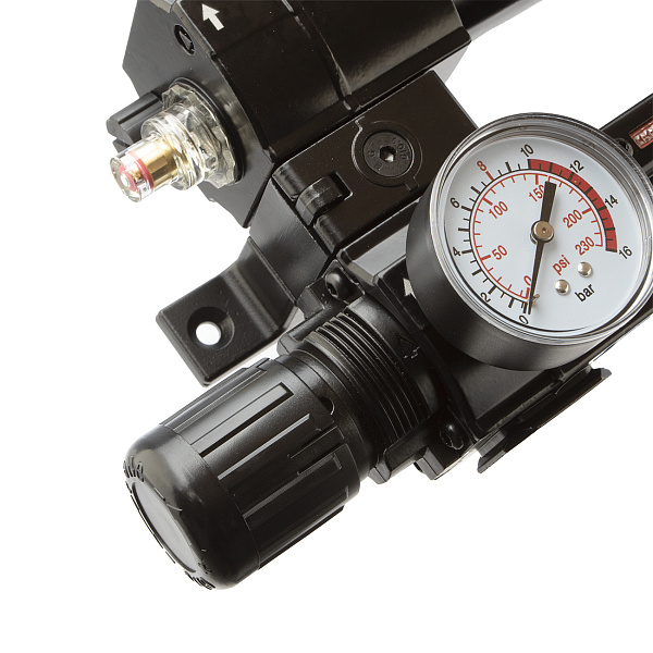 Точная регулировка подачи масла в пневмолинию и давления воздуха. Манометр с двумя вариантами шкалы (PSI и бар) дает работать с разными стандартами измерения давления. Регулятор подачи масла позволяет точно дозировать необходимое количество смазки.