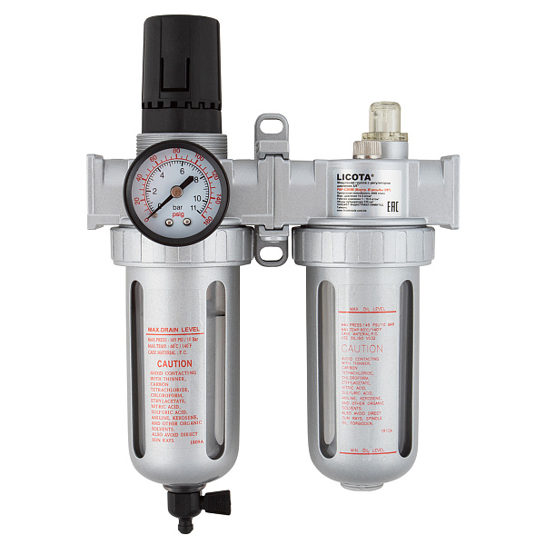 Объединяет воздушный фильтр-осушитель, редуктор с манометром и лубрикатор.