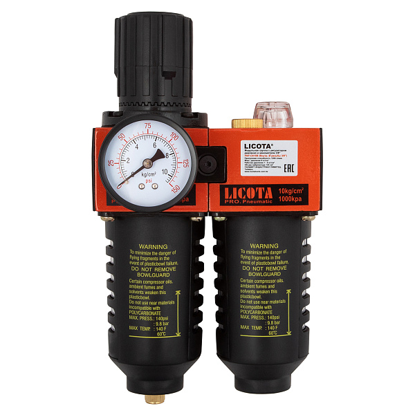 Модульная группа усиленная с регулятором давления и манометром Licota PAP-C615B - это система подготовки воздуха для работы с пневматическим инструментом. Объединяет воздушный фильтр-осушитель, редуктор с манометром и лубрикатор. Оснащена полуавтоматическим клапаном сброса конденсата. (конденсат сливается когда компрессор выключается и давление падает.)