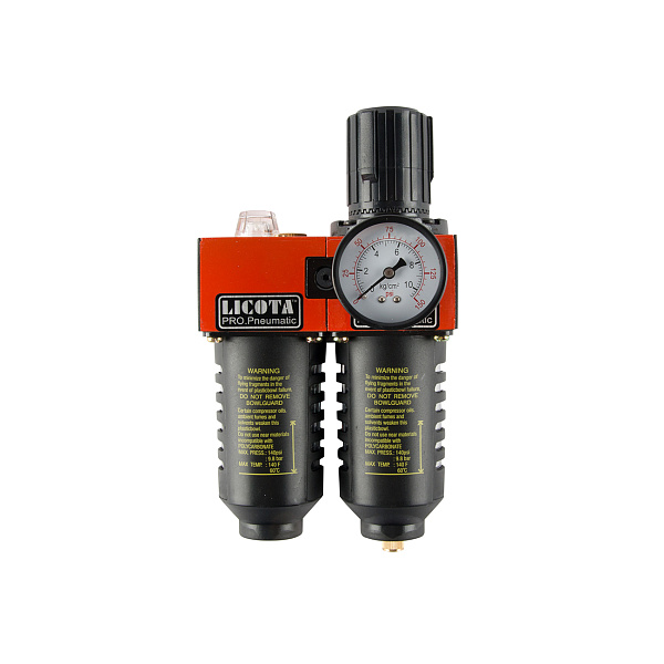 Модульная группа усиленная с регулятором давления и манометром Licota PAP-C615C - это система подготовки воздуха для работы с пневматическим инструментом. Объединяет воздушный фильтр-осушитель, редуктор с манометром и лубрикатор. Оснащена полуавтоматическим клапаном сброса конденсата. (конденсат сливается когда компрессор выключается и давление падает.)