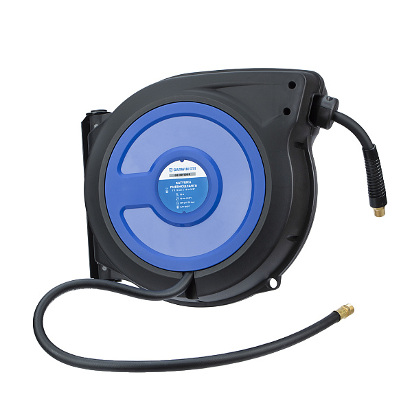 Катушка пневмошланга Garwin GE-RH1009 в пластиковом корпусе. Длина шланга - 9 м. Внутренний диаметр шланга - 10 мм. Диаметр внешней резьбы на вход и на выход - ¼ дюйма.
