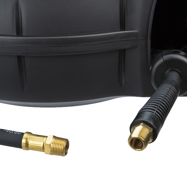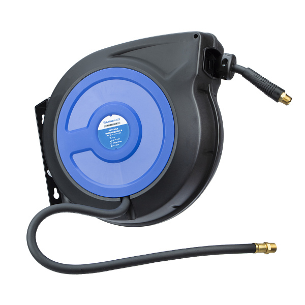 Катушка в прочном пластиковом корпусе обеспечивает дополнительную защиту шланга от внешних воздействий. Поворотное крепление позволяет закрепить катушку в любом удобном месте. Возвратный механизм автоматически наматывает шланг на барабан после отключения. Улучшенный механизм подачи позволяет зафиксировать шланг на любой необходимой длине. Все соединения в катушке герметичны.