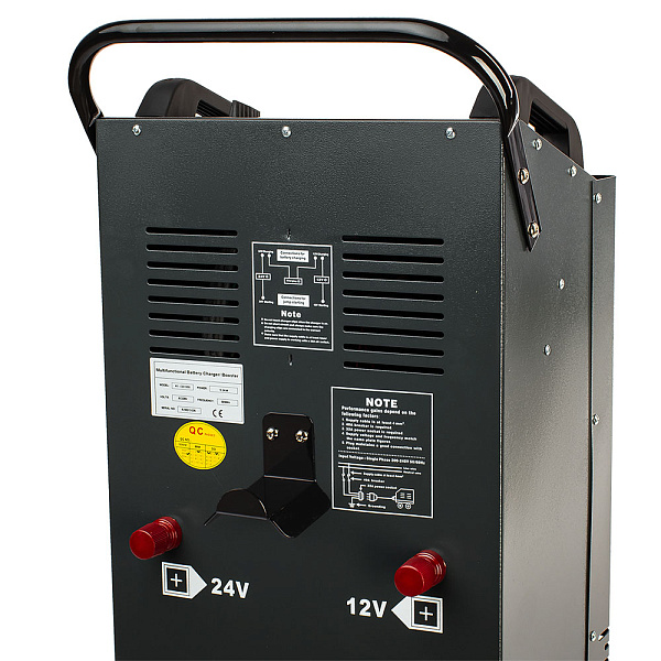 В устройство встроена защита от перегрузок, коротких замыканий и перегрева. Для удобной транспортировки предусмотрены колеса и рукоятка. Прочный металлический корпус предотвращает повреждения. Предусмотрено два режима зарядки: быстрый и медленный. Устройство автоматически определяет емкость аккумулятора и отключается при полном заряде, что увеличивает срок службы аккумуляторов.