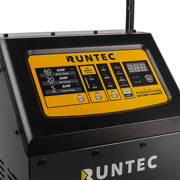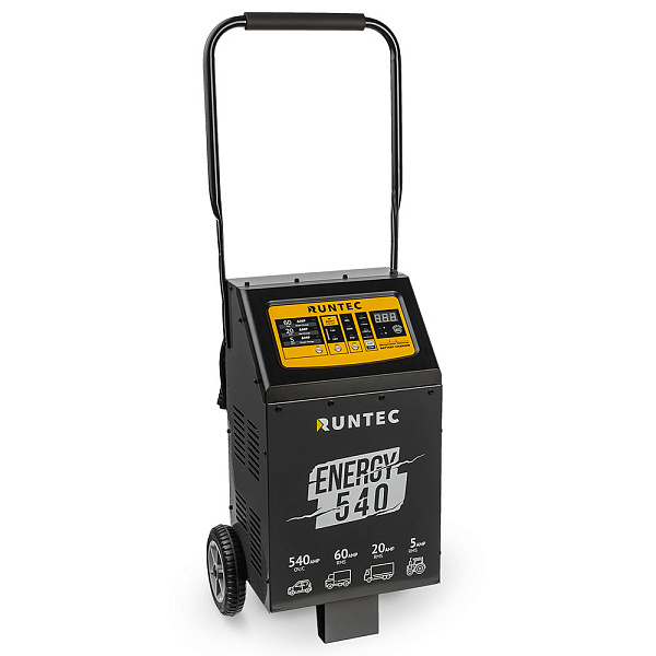 Полностью автоматическое ПЗУ RUNTEC RT-CB540 с микропроцессорным управлением предназначено для зарядки свинцовых аккумуляторов с напряжением 12 В и 24 В емкостью от 20 до 700 Ач, запуска бензиновых и дизельных двигателей мотоциклов, легковых и грузовых автомобилей, строительной и сельскохозяйственной техники. Устройство соответствует требованиям для зарядки и облегчения запуска большинства автомобильных аккумуляторов. Габариты — 280х220х470 мм. Максимальная потребляемая мощность в режиме пуска — до 2.5 КВт, в режиме зарядки — до 1.2 КВт.