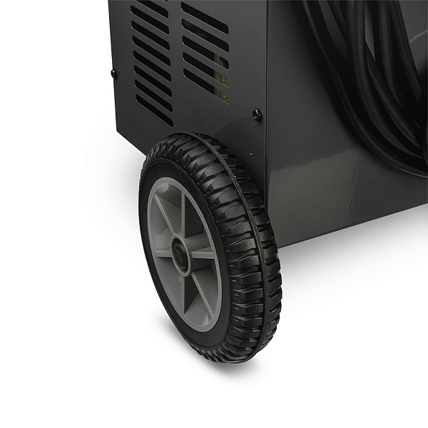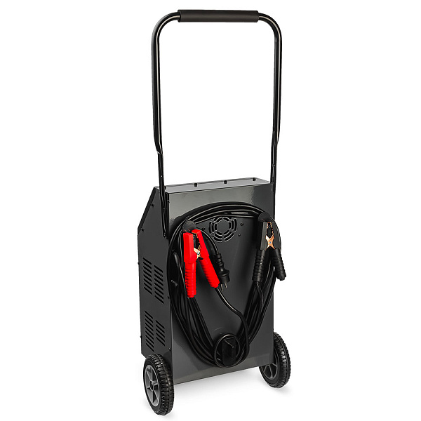 Режимы зарядки аккумулятора управляются с помощью микропроцессора. Интуитивно понятное управление и цифровой дисплей делают использование максимально простым и удобным. Для выбора вольтажа не требуется менять провода, достаточно переключить режим с помощью клавиш. Рукоятка снабжена специальным матом для подвешивания стартовых проводов: оператору не нужно тратить время на их сматывание.