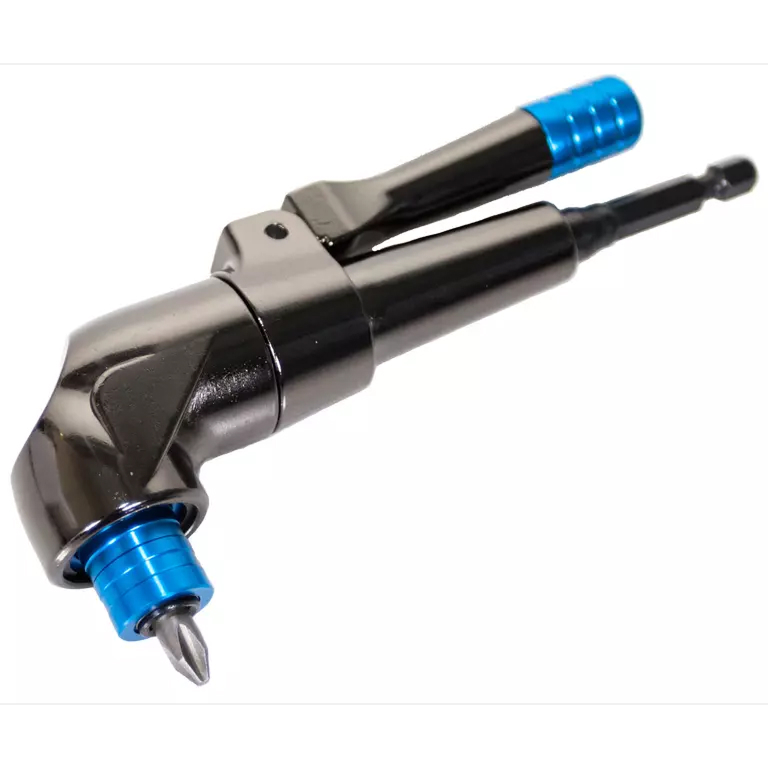 Механизм держателя с редуктором даёт возможность расположить биту под углом 90° к рабочему инструменту. Это облегчает работу в ограниченном пространстве, куда не подлезть битой в стандартном держателе. Инструмент оснащён удобной подвижной рукояткой.