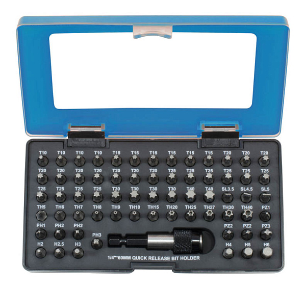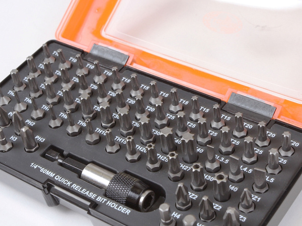 Комплектация набора позволяет проводить широкий спектр работ по ремонту и обслуживанию автомобилей и другой техники, не используя сторонние биты и наборы.