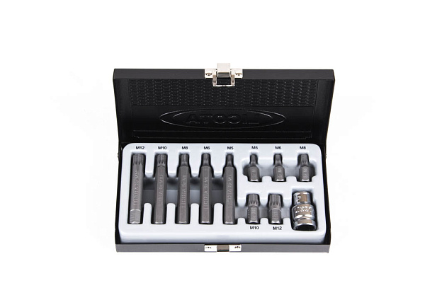 Комплект из 10 бит и переходника используется для работы с крепежом с внутренним профилем Spline (12 граней).