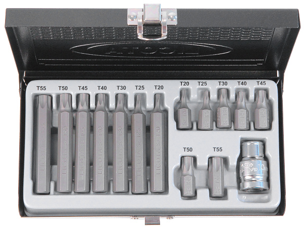 Комплект из 14 бит и переходника используется для работы с крепежом с внутренним профилем Torx.