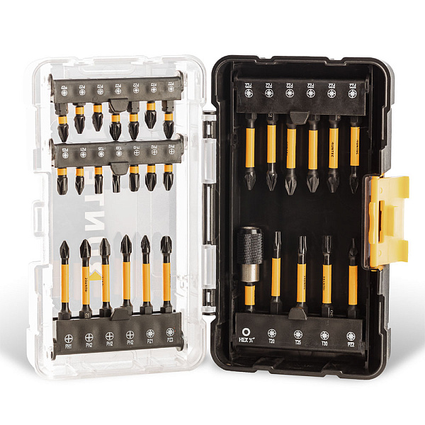 Набор поставляется в эргономичном кейсе из ударопрочного пластика. Для удобства хранения и транспортировки кейсы можно штабелировать и скреплять между собой, создавая систему хранения. Держатели бит легко достаются и заменяются.