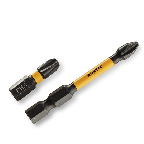 Биты изготовлены из стали S2, закаленной до 58-62 HRC, что увеличивает их износостойкость. Специальная торсионная зона частично амортизирует пиковые нагрузки тангенциального удара, снижая риск поломки биты и крепежа. Фосфатное покрытие бит эффективно защищает от коррозии. Точная геометрия шлица и намагниченность обеспечивают надежную фиксацию крепежа точно по центру.