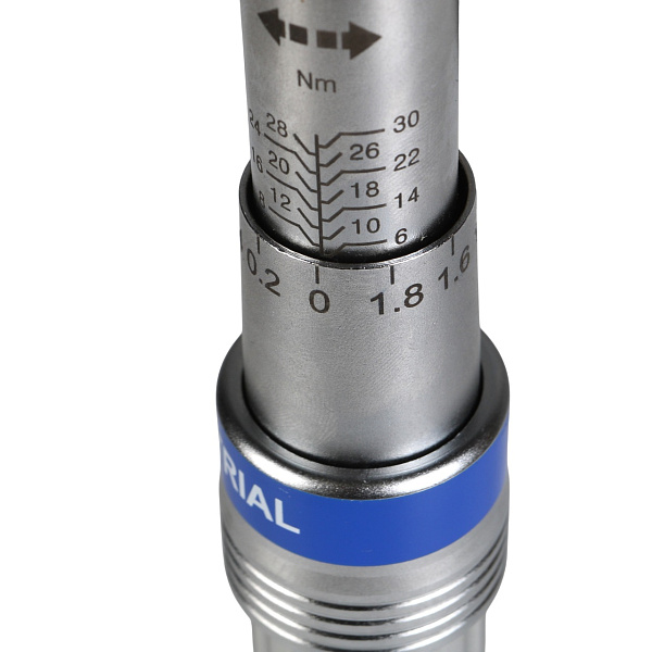 Нажимной фиксатор у верха рукоятки обеспечивает надежную блокировку установленного момента, предотвращая случайное переключение. При достижении установленного момента происходит размыкание динамометрического механизма. Оператор слышит громкий щелчок и ощущает его рукой.