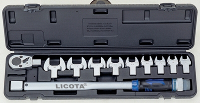 Динамометрический ключ Licota AQC-S001NM одностороннего действия, в наборе со сменными насадками. Комплект из 11 предметов в пластиковом кейсе предназначен для затяжки резьбовых соединений с требуемым моментом. Используется для соединений с правой резьбой.