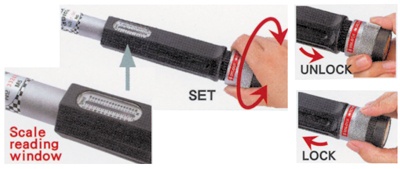 Нажимной фиксатор надежно блокирует установленное значение момента. При достижении установленного момента происходит размыкание динамометрического механизма. Оператор слышит громкий щелчок и ощущает его рукой.