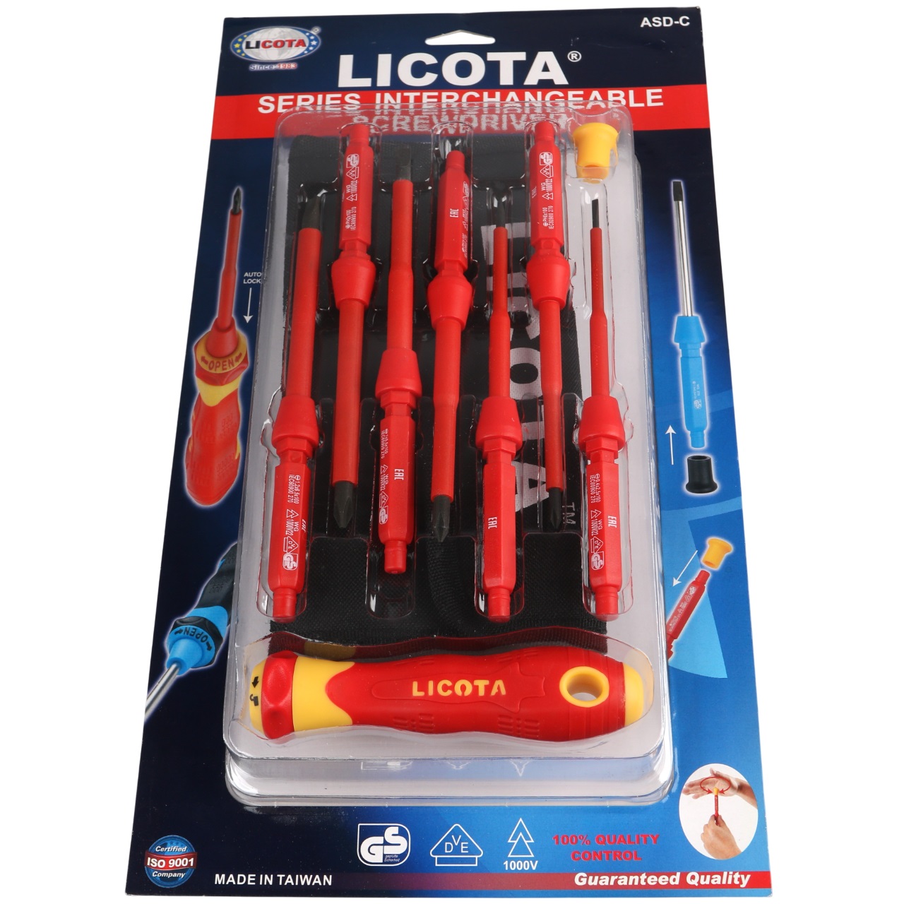 Отвертка диэлектрическая со сменными вставками Licota ASD-CVS101K, набор из 8 предметов. В комплект входят 4 жала с профилем SL (шлиц), 3 жала с профилем PH (крест) и двухкомпонентная рукоятка-держатель. Длина сменных жал - 100 мм.