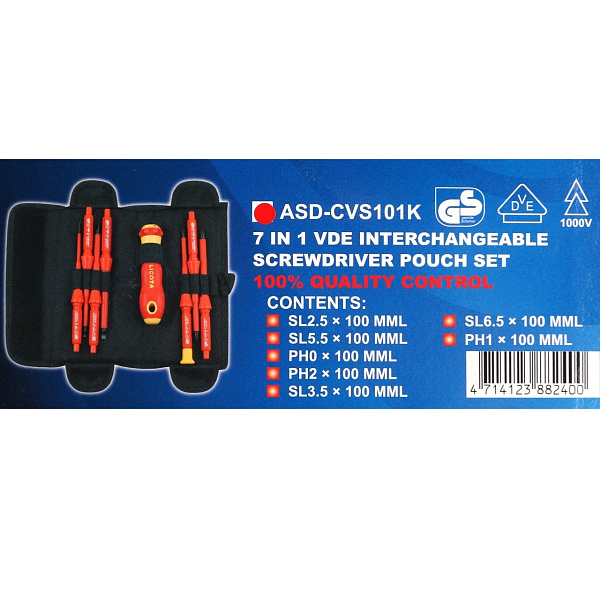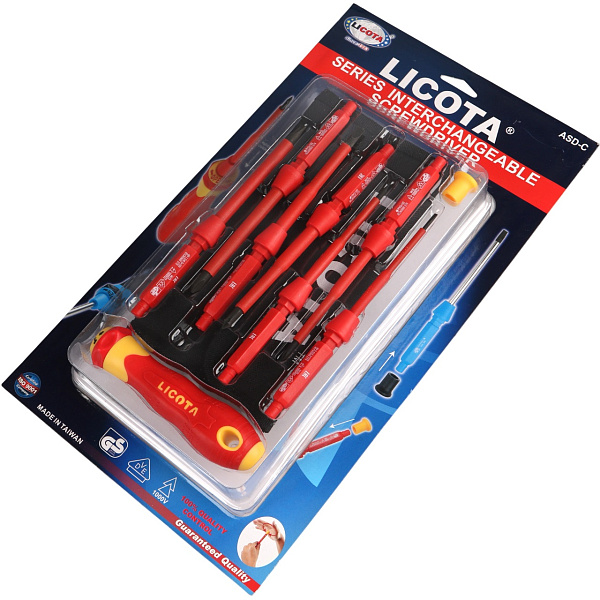 Отвертка диэлектрическая со сменными вставками Licota ASD-CVS101K, набор из 8 предметов. В комплект входят 4 жала с профилем SL (шлиц), 3 жала с профилем PH (крест) и двухкомпонентная рукоятка-держатель. Длина сменных жал - 100 мм.