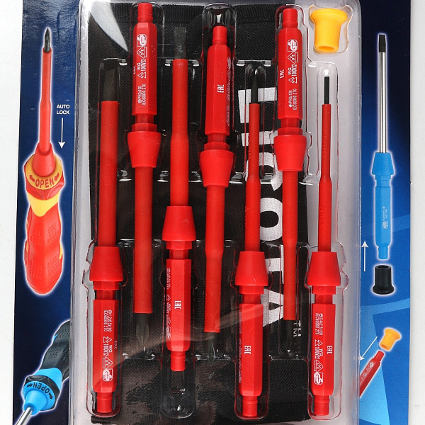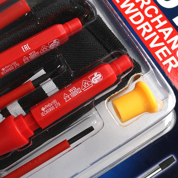 Стержни отверток защищены изолирующим покрытием. Допускается для производства слесарно-монтажных работ в электроустановках до 1000 В. Изоляция диэлектрического инструмента проверена согласно DIN EN 60900 (IEC 60900) в специальной среде (электролит) при напряжении в 10 000 В.