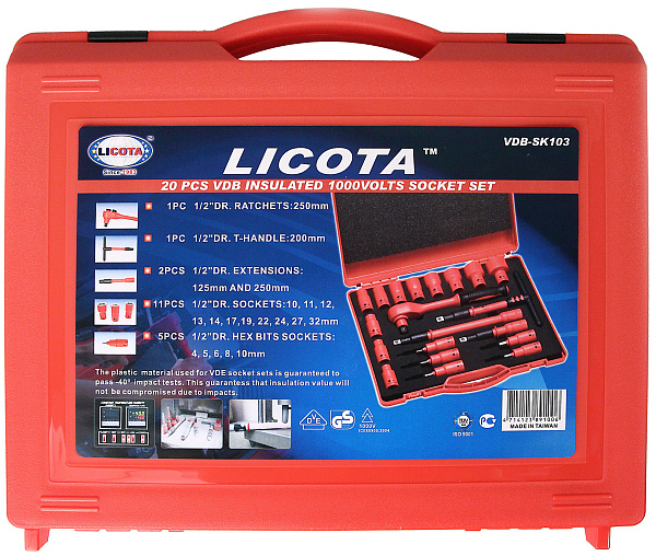Набор диэлектрических инструментов Licota VDB-SK103 из 20 предметов, электробезопасного, для работы с резьбовым крепежом в электроустановках с напряжением до 1000 V.