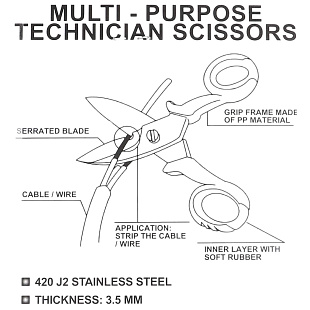 Ножницы изготовлены из прочной стали с индукционной закалкой. Твердость лезвий - 51-55 HRC. Позволяет резать медные провода диаметром до 3,5 мм.