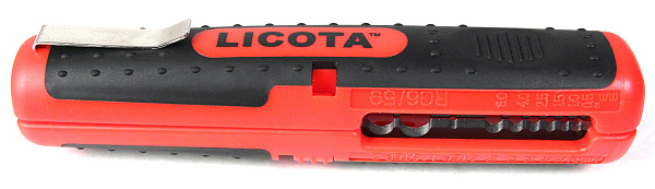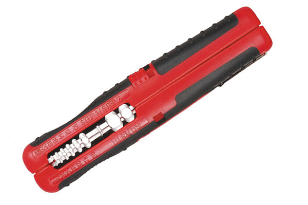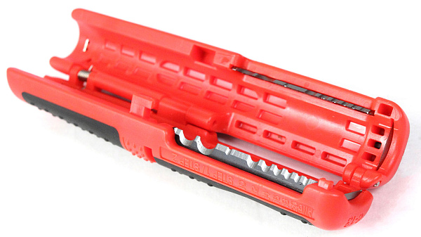 Раскрывающаяся рукоятка со вставками из термопластичного полимера и замком-фиксатором. Инструмент имеет шкалу для выставления длины снятия изоляции.