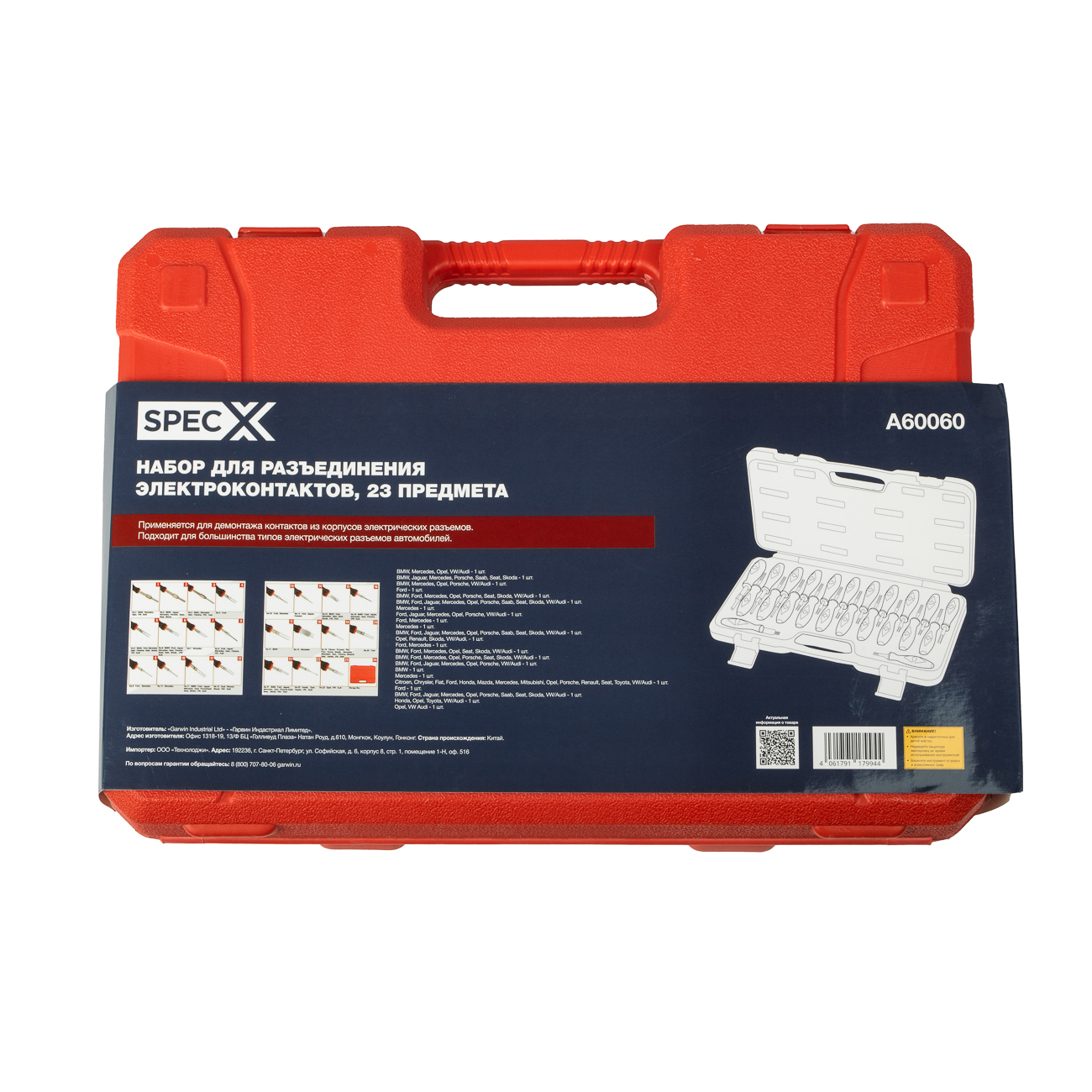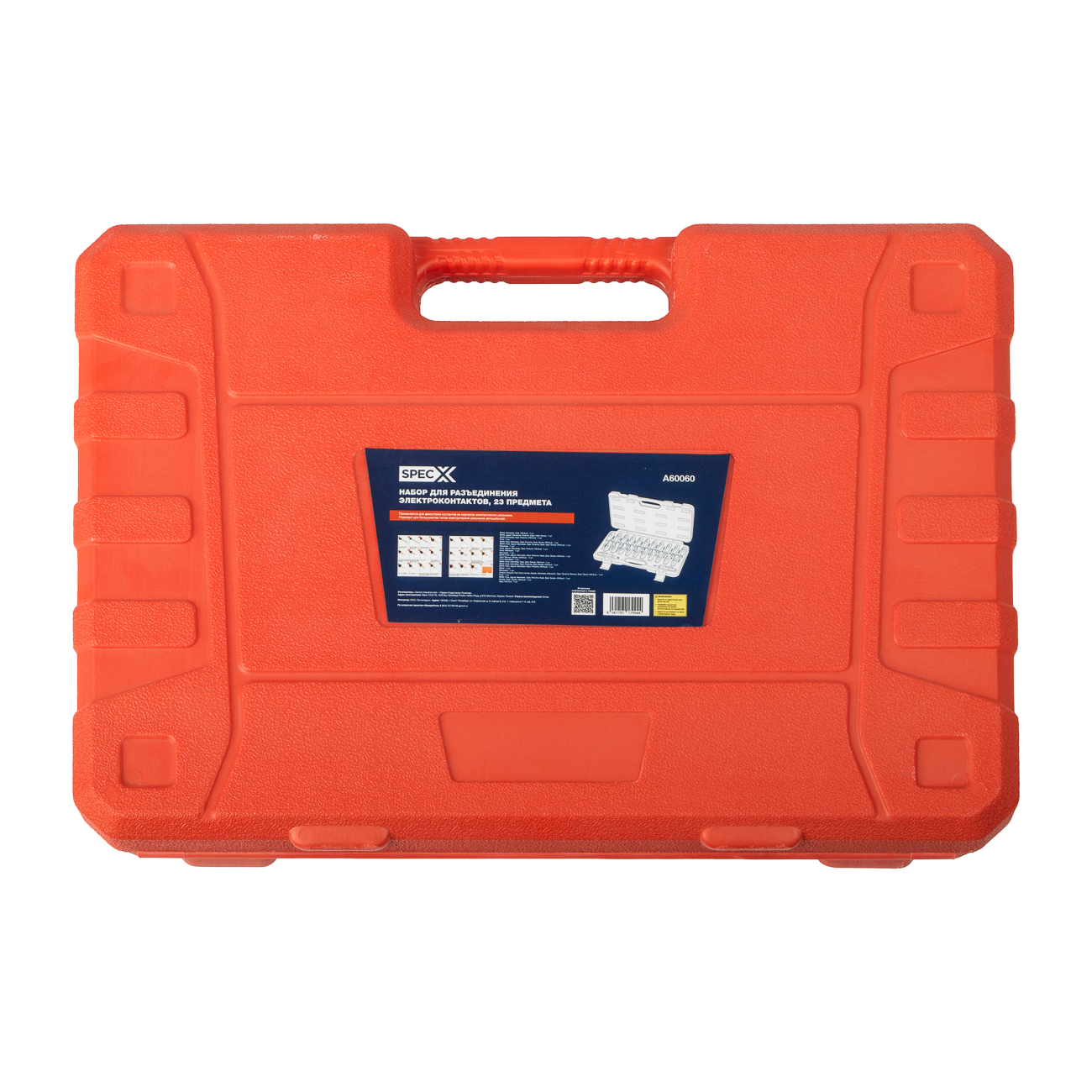 Набор приспособлений для разъединения электроконтактов SPECX A60060. Комплект из 23 предметов в пластиковом кейсе предназначен для бережного демонтажа контактов (плоских, круглых и др.) из разъемов. Экстракторы в комплекте служат для разблокировки замков контактов в электрических разъемах.