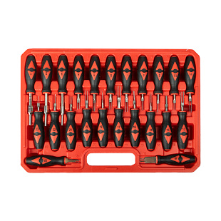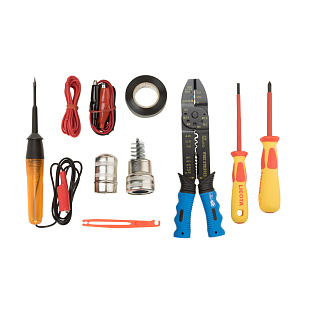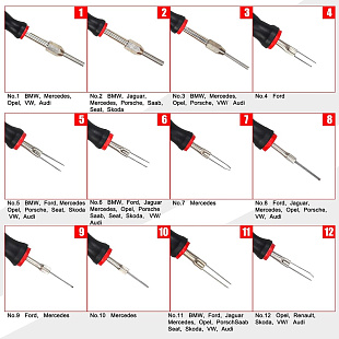Набор позволяет работать с большинством разъемов, используемых на легковых, грузовых автомобилях и автобусах. В наборе содержится 23 приспособления, что избавляет от покупки элементов по отдельности и дает возможность работы с разными видами электрооборудования.