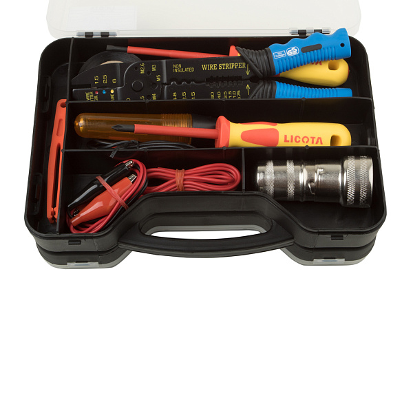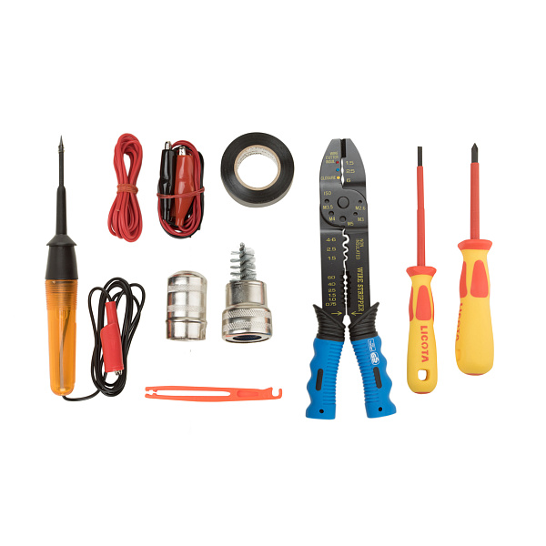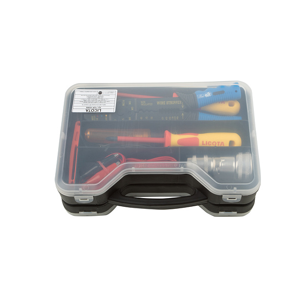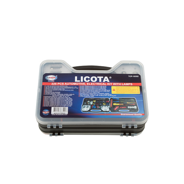 Набор автоэлектрика Licota TCP-10352. Комплект из 226 предметов поставляется в пластиковом кейсе. Содержит необходимые инструменты и расходники для ремонта электропроводки и электрооборудования автомобиля.