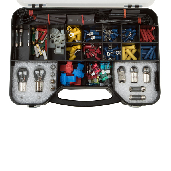 Все необходимое для ремонта оборудования и проводки автомобилей широкого ряда марок и моделей, собранное в одном месте. Каждый компонент находится в в своей ячейке.