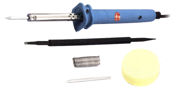 Оснащен нихромовым нагревательным элементом с межслойной изоляцией из слюды. Поставляется в комплекте с флюсом, сменным жалом, припоем и антистатической лопаткой.