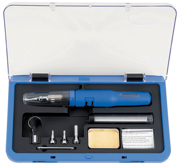 - Паяльник возможно использовать там, где отсутствует электрическая сеть. В комплекте есть инструмент для очистки паяльника.