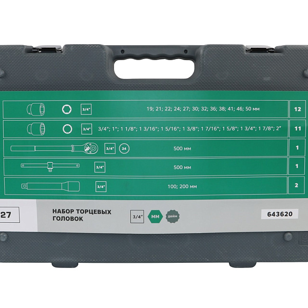 Набор торцевых головок 3/4" дюйм. и метр. 27 пр. (3/4"-2", 19-50 мм), GARWIN PRO, 643620
