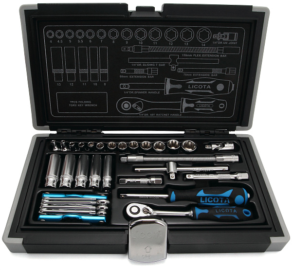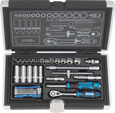 Набор торцевых головок с аксессуарами Licota ALK-0004 предназначен для ручного монтажа/демонтажа резьбового крепежа. Комплект из 32 предметов поставляется в прочном пластиковом кейсе.