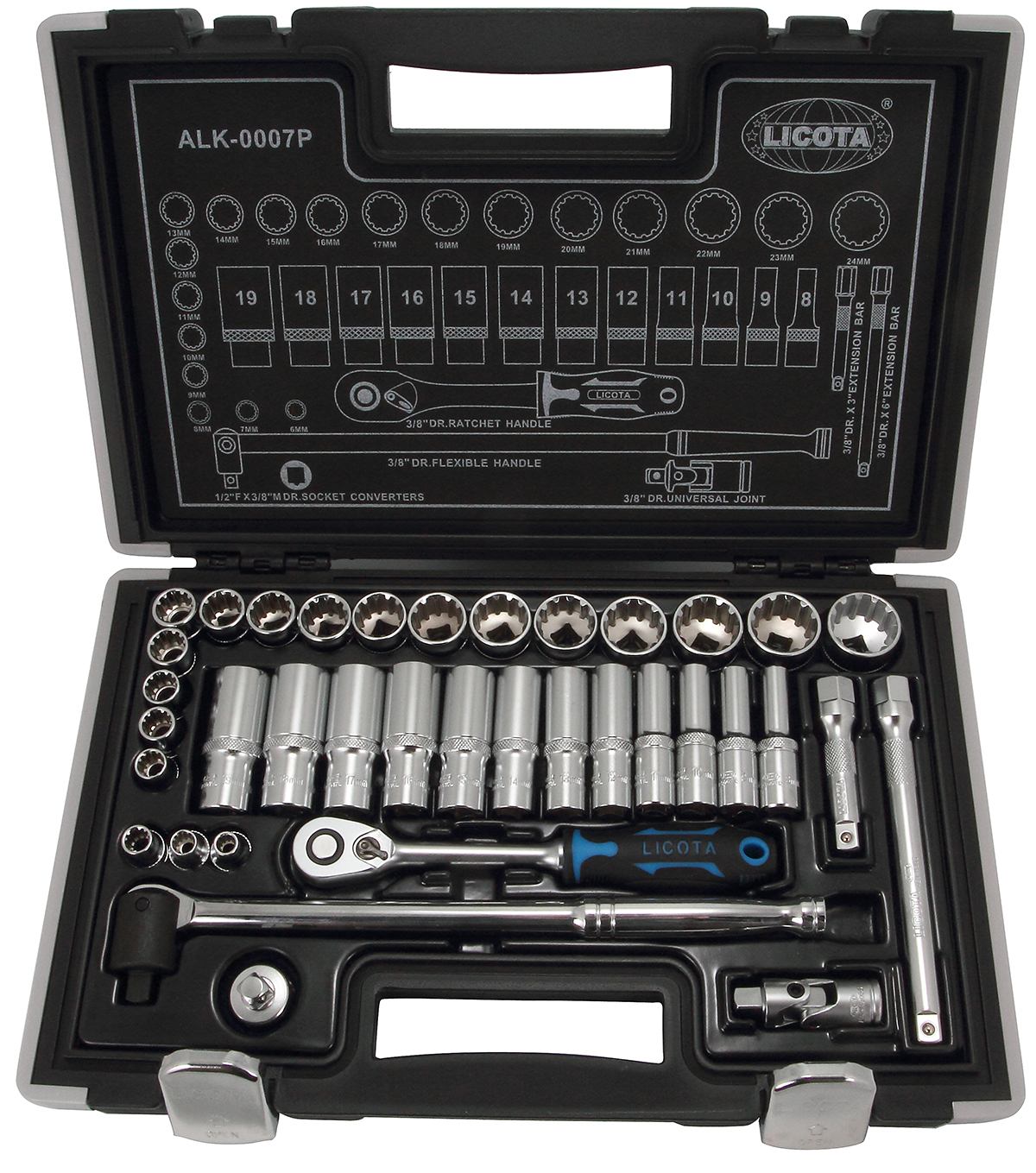 Набор торцевых головок с аксессуарами Licota ALK-0007P предназначен для ручного монтажа/демонтажа резьбового крепежа с рабочим профилем Spline. Размер привода - 3/8".