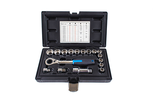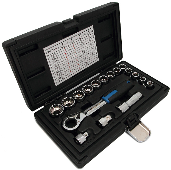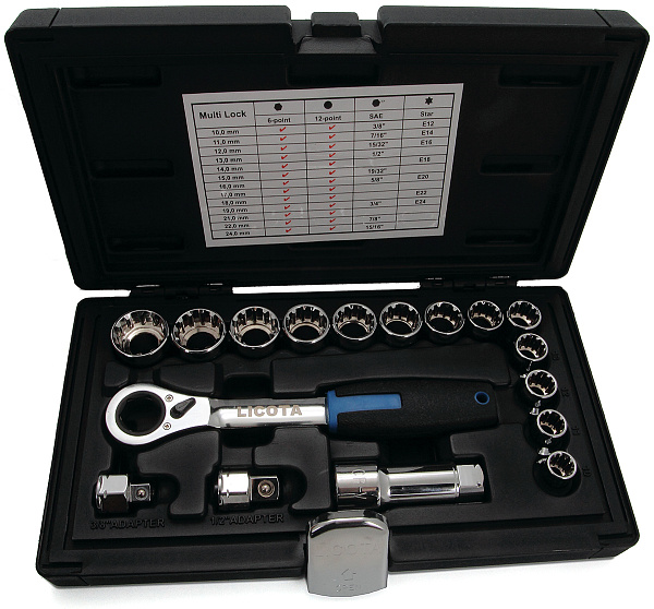 Набор торцевых головок с проходных аксессуарами Licota ALK-1006P предназначен для ручного монтажа/демонтажа резьбового крепежа с рабочим профилем Spline, в том числе и гаек на длинных шпильках.