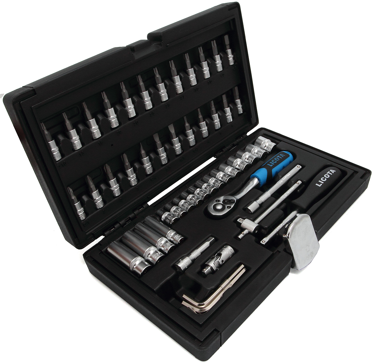 Набор торцевых головок с аксессуарами Licota ALK-8003F предназначен для ручного монтажа/демонтажа резьбового крепежа. Комплект из 54 предметов поставляется в прочном пластиковом кейсе.