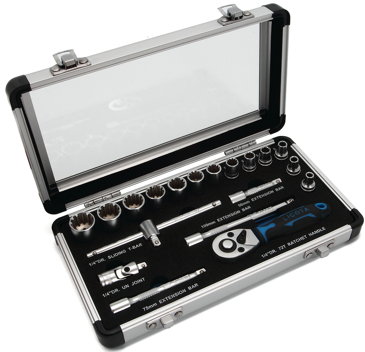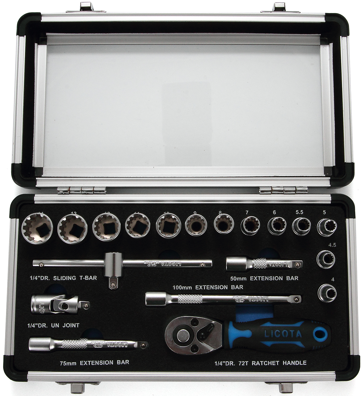 Набор торцевых головок с аксессуарами Licota ALM-3001 предназначен для ручного монтажа/демонтажа резьбового крепежа с рабочим профилем Spline. Размер привода - 1/4".
