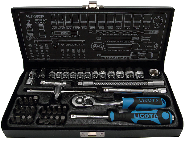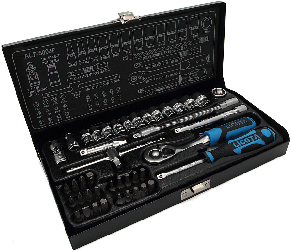 Набор торцевых головок с аксессуарами Licota ALT-5009F предназначен для ручного монтажа/демонтажа резьбового крепежа. Комплект из 43 предметов поставляется в прочном металлическом кейсе.